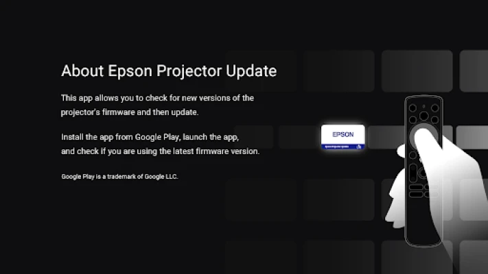 Epson Projector Update on erityisesti suunniteltu sovellus Epson-projektoreiden laiteohjelmiston päivittämiseen. Sen avulla varmistat, että Google TV™ -projektorisi pysyy aina ajan tasalla uusimpien ominaisuuksien ja parannusten kanssa. Pidä projektorisi suorituskyky optimoituna vaivattomasti.