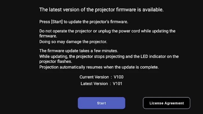 Käyttökokemuksesi tehostamiseksi tämä sovellus ilmoittaa sinulle automaattisesti ponnahdusikkunana, kun uusi laiteohjelmistopäivitys on saatavilla, jotta et koskaan jää paitsi tärkeistä parannuksista. Voit vaivattomasti tarkistaa projektorisi nykyisen laiteohjelmistoversion suoraan sovelluksesta ja päivittää sen helposti viimeisimpään versioon muutamalla napautuksella. Pidä laitteesi aina parhaassa iskussa ja hyödynnä kaikki sen potentiaali intuitiivisen hallinnan avulla, varmistaen sujuvan ja miellyttävän mediasisällön toiston.