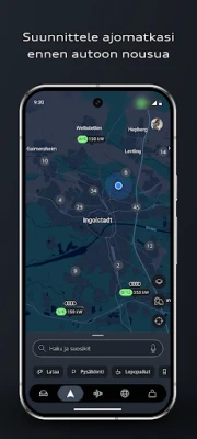 Suunnittele matkasi ennennäkemättömän helposti myAudi-sovelluksen kautta. Voit vaivattomasti lähettää kohteita ja kokonaisia reittejä suoraan mobiililaitteeltasi ajoneuvoosi, varmistaen sujuvan siirtymän suunnittelusta toteutukseen. Sovellus tukee myös kävelyreittien suunnittelua autollesi saapumiseen asti. Sähköautoilijoille myAudi-sovellus tarjoaa kattavat työkalut lataustapahtumien hallintaan, näyttäen tarkat tiedot sähköisen toimintasäteen, latauksen tilan ja jäljellä olevan latausajan osalta, tehden jokaisesta sähköisestä matkasta huolettoman.