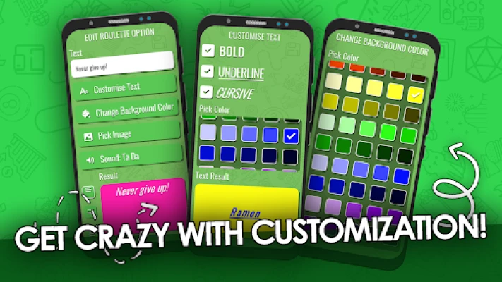 Oletko joskus tuntenut itsesi täysin jumiutuneeksi lukuisten vaihtoehtojen keskellä? Spin Wheel - Decision Roulette on paras työkalu, joka muuttaa epävarmuuden hauskaksi ja välittömäksi ratkaisuksi. Unohda loputon harkinta ja anna sattuman pyörän päättää puolestasi! Voit vaivatta syöttää jopa viisikymmentä erilaista vaihtoehtoa jokaiseen räätälöityyn rulettiin, ja Spin Wheel - Decision Roulette huolehtii lopusta. Kaikki luomasi tiedot tallennetaan turvallisesti vain laitteellesi, varmistaen yksityisyytesi ja tietoturvan ilman ulkoista pilvitallennusta.