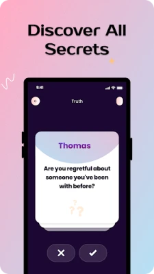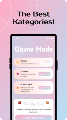 Koe vertaansa vailla oleva valikoima haasteita ja tunnustuksia, jotka on jaoteltu useisiin ainutlaatuisiin pelitiloihin. Aloita leppoisammin "Todelliset enkelit" -paketilla, joka lämmittää tunnelman hellävaraisesti. Nosta panoksia "Crazy and Devilish" -tilassa, joka testaa rohkeimmatkin sielut. Etsitkö jotain vielä uskaliaampaa? "Naughty and Devilish" ja "Helvetin portilla" tarjoavat aikuisille suunnattuja, kiihkeitä kysymyksiä ja tulisia haasteita. Pariskunnille suunnattu "Aatami ja Eeva" puolestaan syventää suhdettanne hauskoilla ja intiimeillä kysymyksillä. Satoja kysymyksiä ja tehtäviä odottaa löytämistään, ja uutta sisältöä lisätään säännöllisesti pitämään hauskuus yllä!